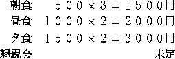 宿泊は一泊5000円位の予定で食費は下記の通りです。 (ただしいずれも予定価格で消費税を含んでいません)。